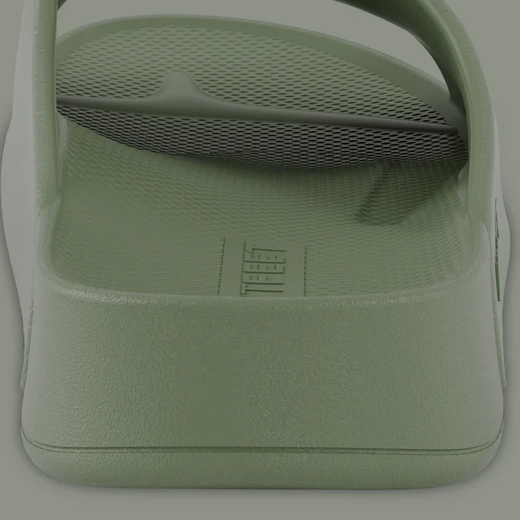 Back angle view of the arch contour of the khaki Lightfeet Single Strap Slide